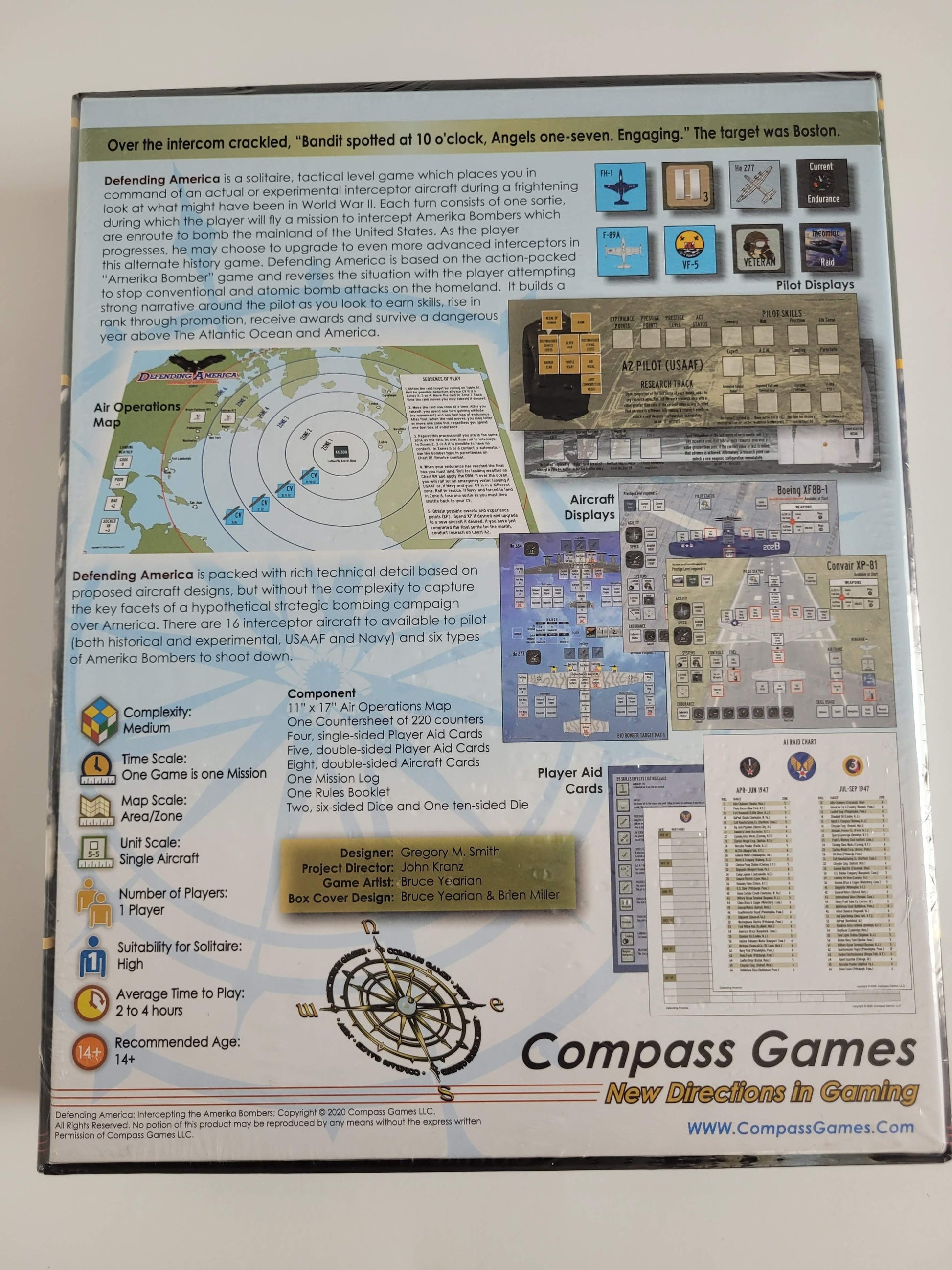 Defending America is a solitaire, tactical level game which places you in command of an actual or experimental interceptor aircraft during a frightening look at what might have been in World War II. Each turn consists of one sortie, during which the player will fly a mission to intercept Amerika Bombers which are en route to bomb the mainland of the United States. As the player progresses, he may choose to upgrade to even more advanced interceptors in this alternate history game. It builds a strong narrative around the pilot as you look to earn skills, rise in rank through promotion, receive awards and survive a dangerous year above the Atlantic Ocean and America.